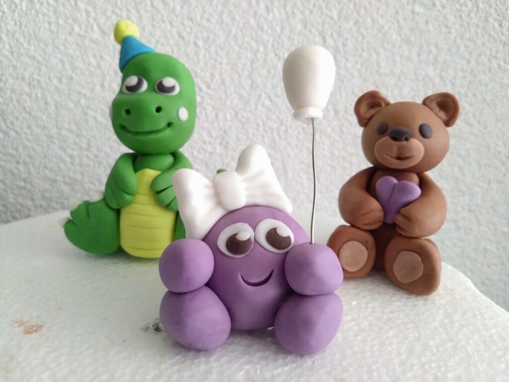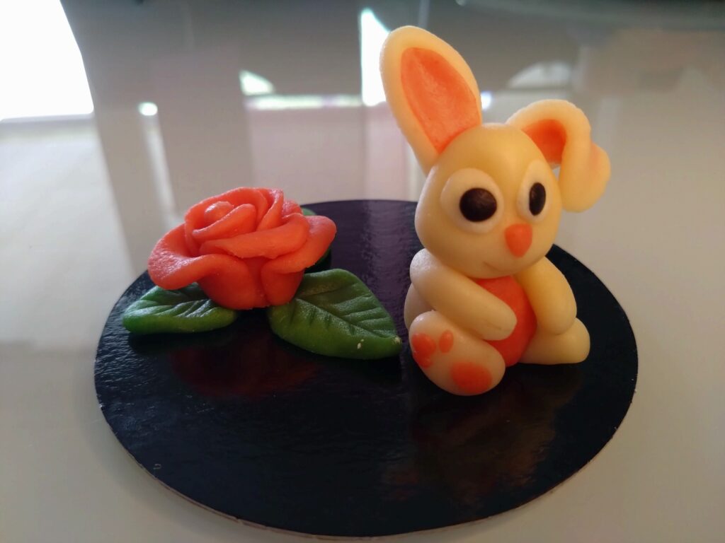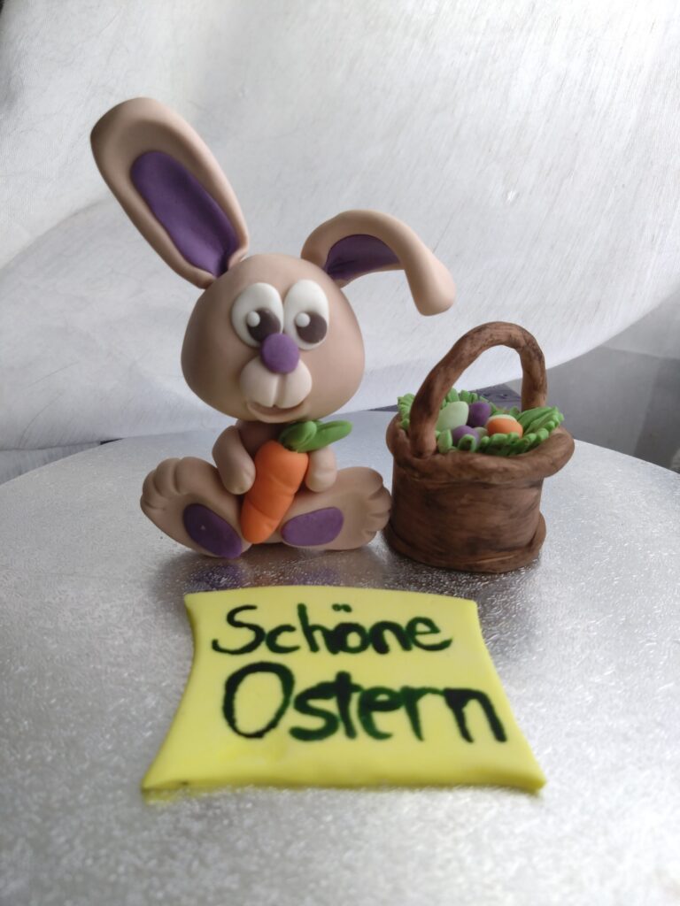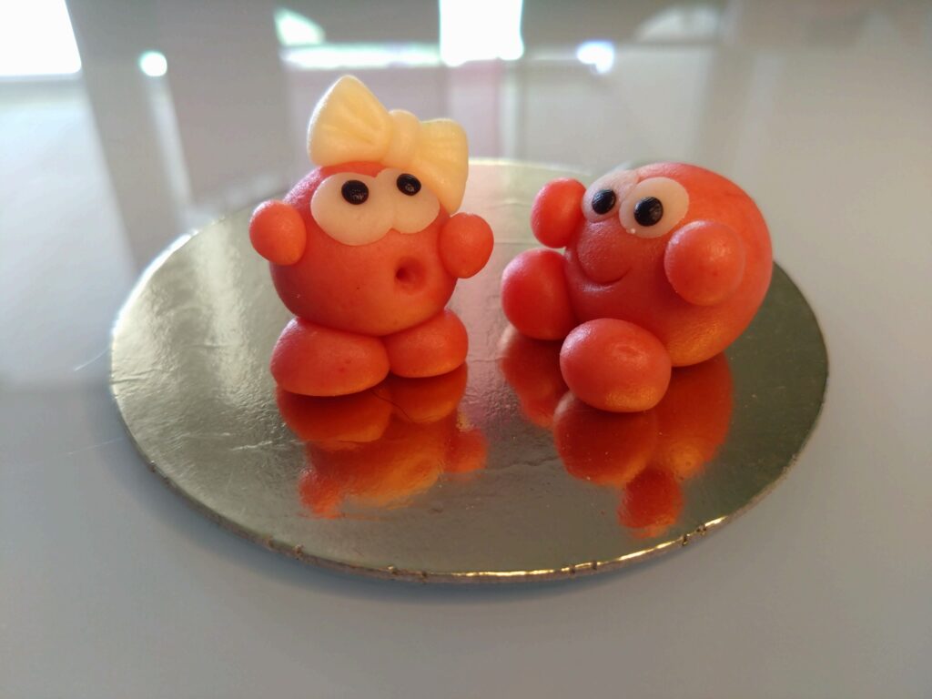 - Figur aus Saracino Pasta Model: eine Figur aus Modellierfondant, welche knallige und klare Farben erlaubt. Aus Modellierfondant können grössere Figuren hergestellt werden, jedoch sind sie sehr hart und dadurch nicht zum Essen geeignet. Die Figuren sind stabil und haltbar, sodass sie nach dem Verzehr der Torte zu Hause als Deko verwendet werden können.