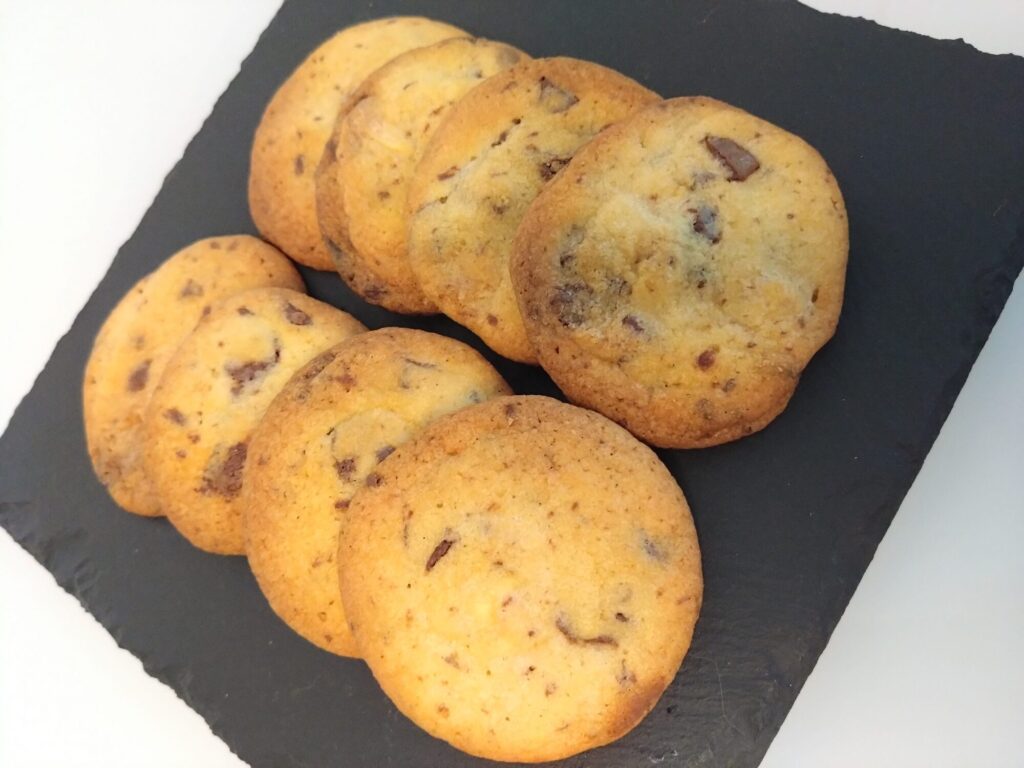 - Knusprige Cookies: leicht gesalzene, süsse Cookies mit dunklen Schokoladenstückchen