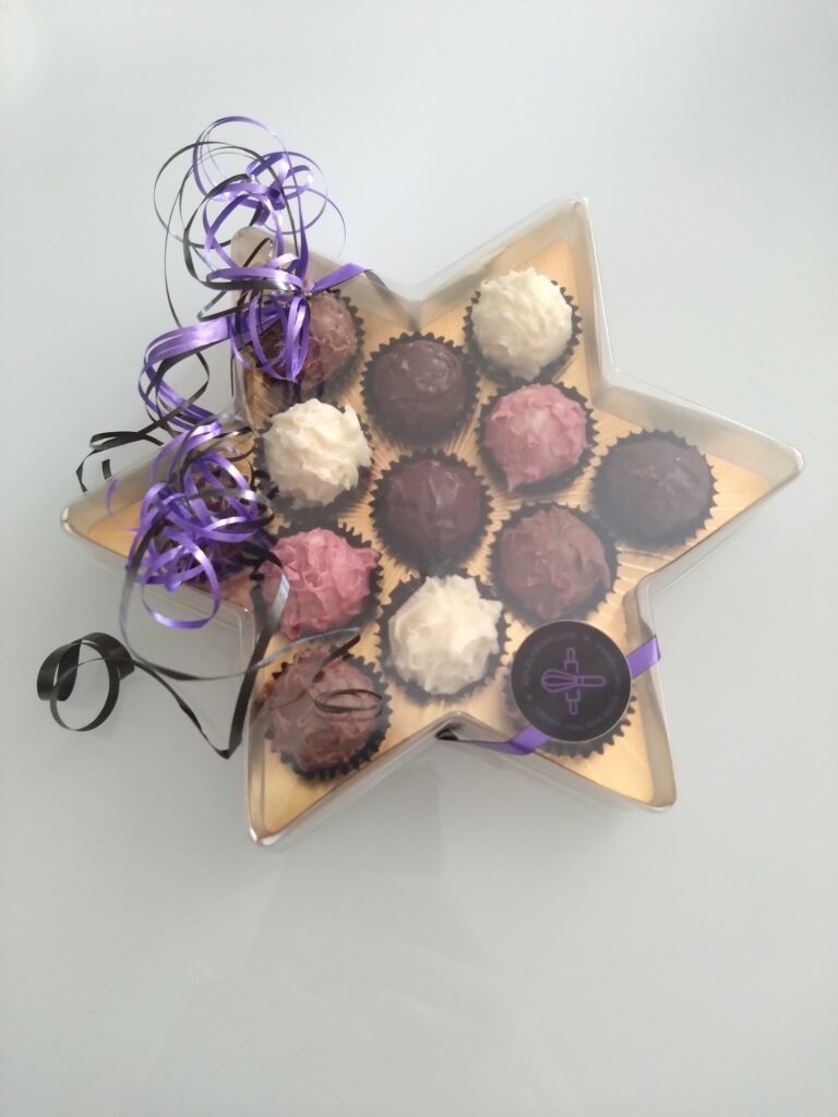 - Sternfömige Pralinenschachtel: Die Pralinensorten sind noch vakant (auf alle Fälle wird eine mit Lebkuchen dabei sein).