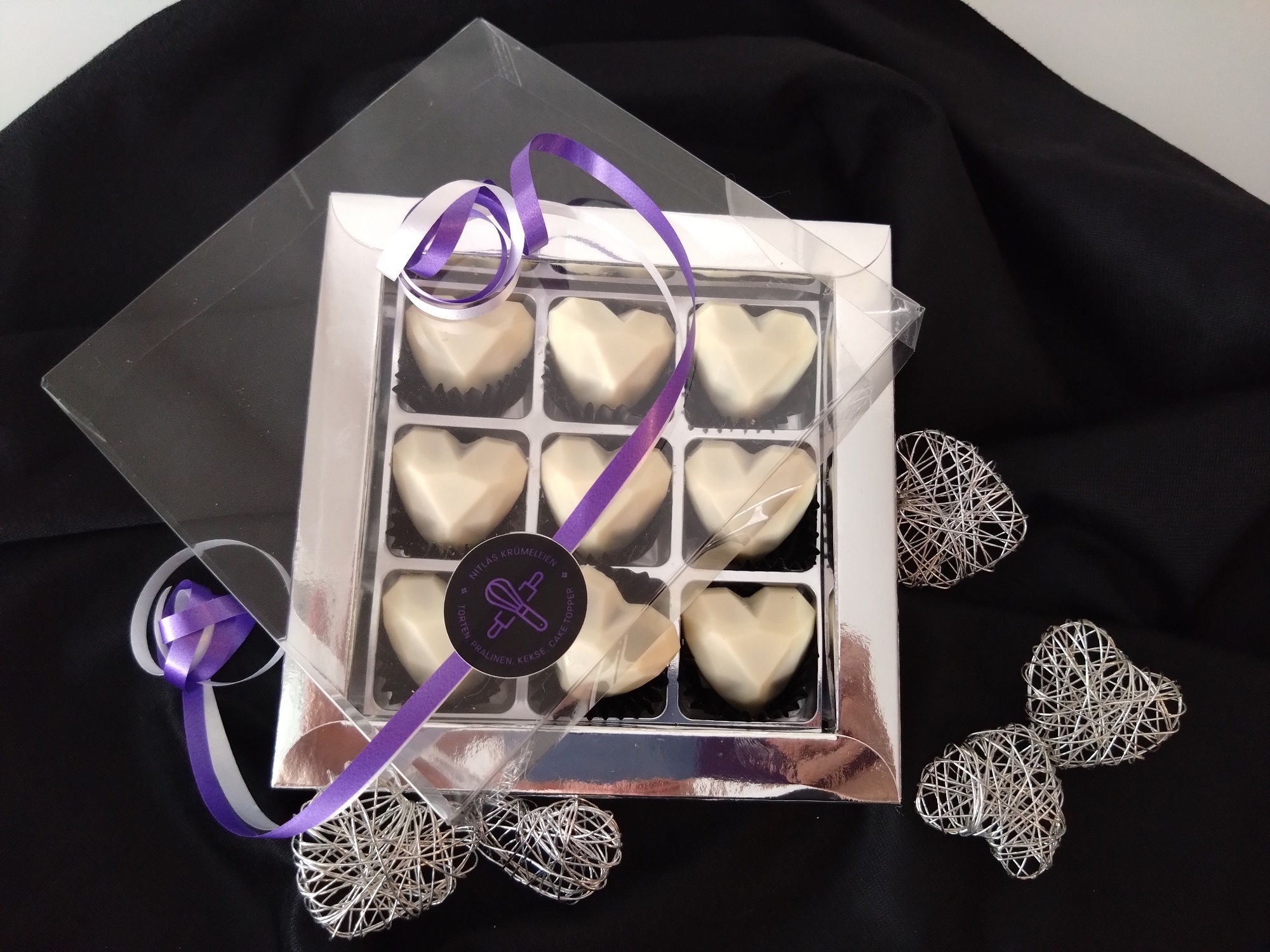Weisse Herzpraline gefüllt mit cremigem Himbeercaramel.